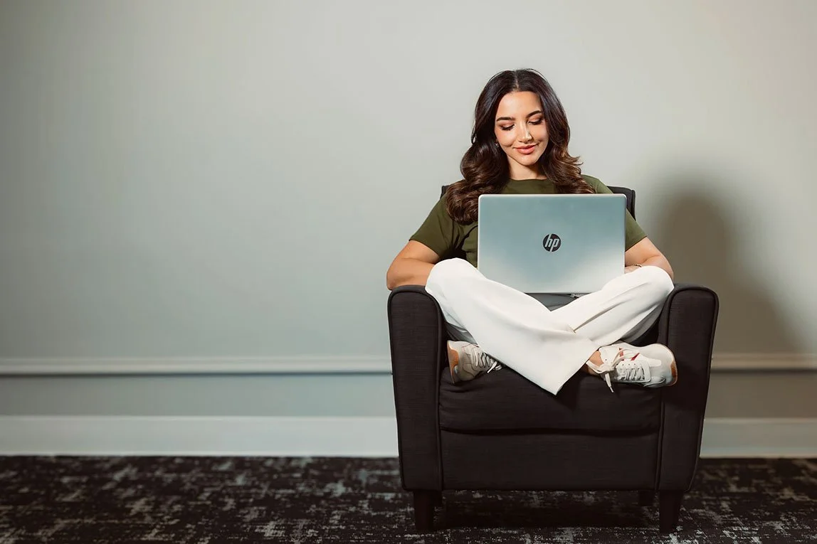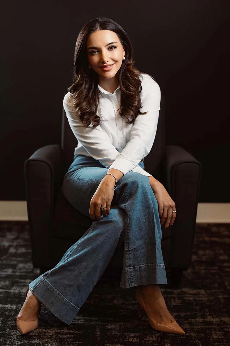 A woman with long dark hair, wearing a white blouse, blue jeans, and nude heels, sits on a black armchair against a dark background, smiling at the camera.